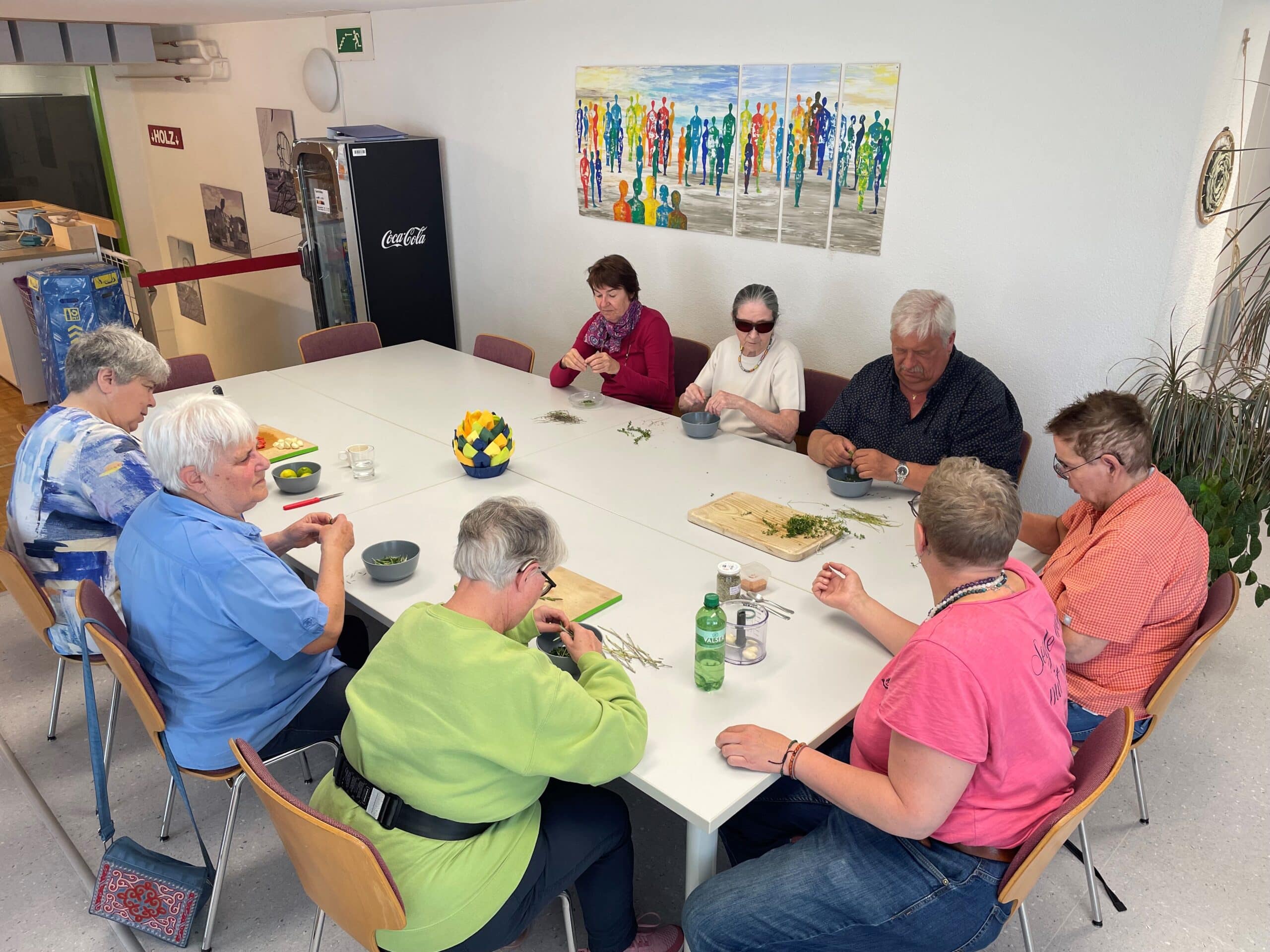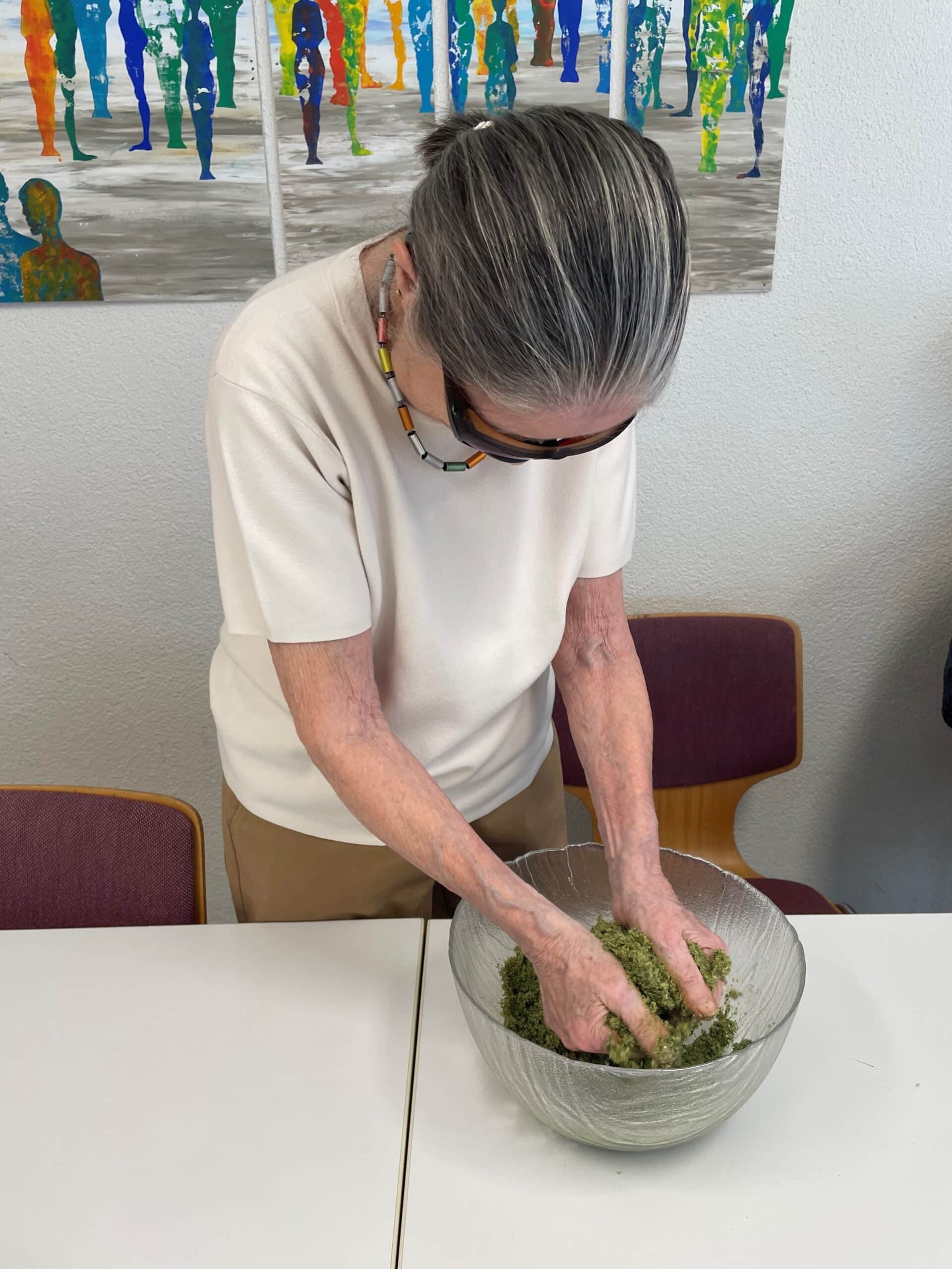 Mit viel Engagement und guter Laune wurde gezupft, gehackt, gemörsert, gestampft und geknetet. Jeder Handgriff zählte, es gab für alle etwas zu tun. Es wurde zusammen gearbeitet, sich gegenseitig unterstützt und zwischendurch auch immer wieder gelacht.