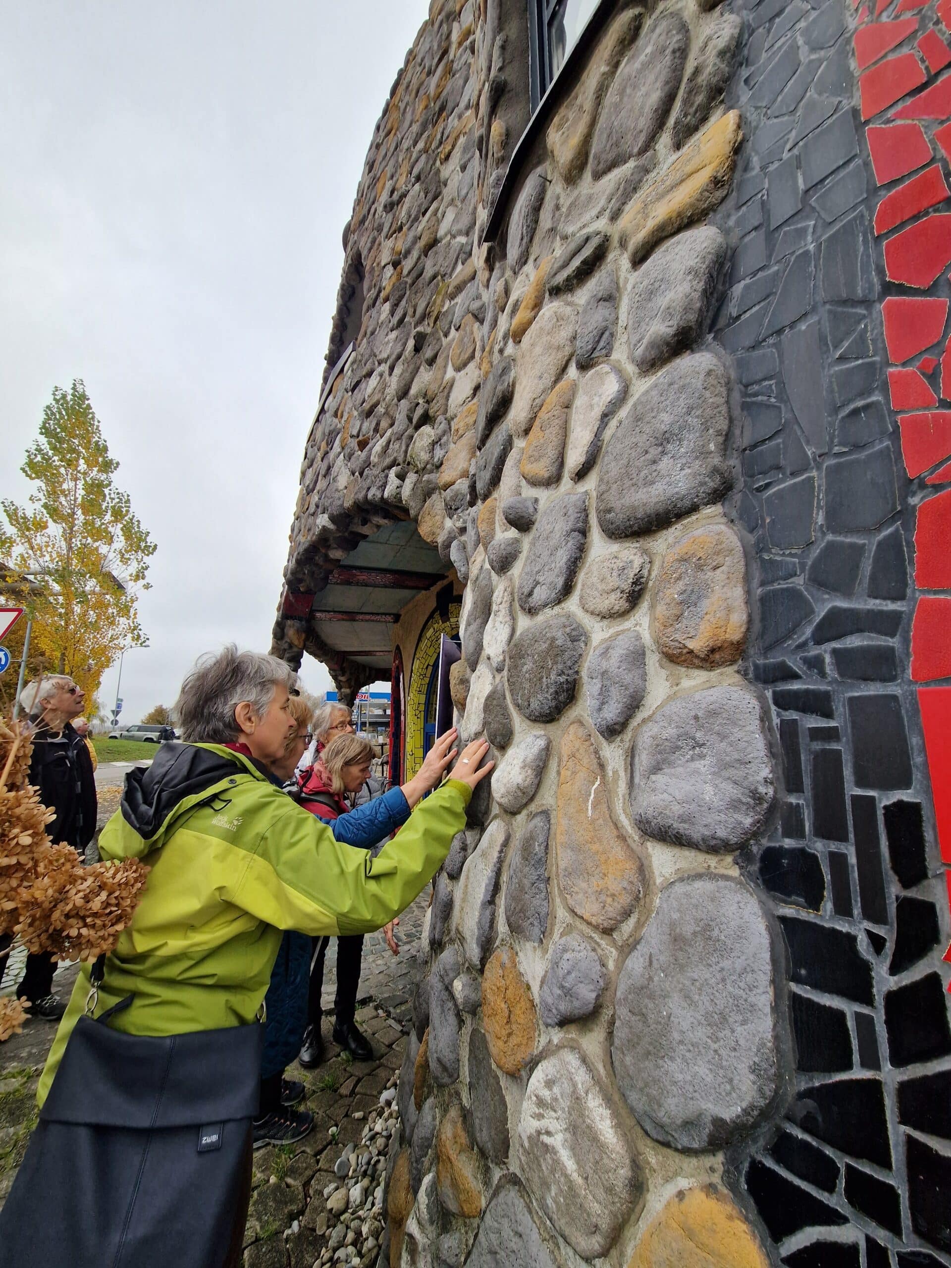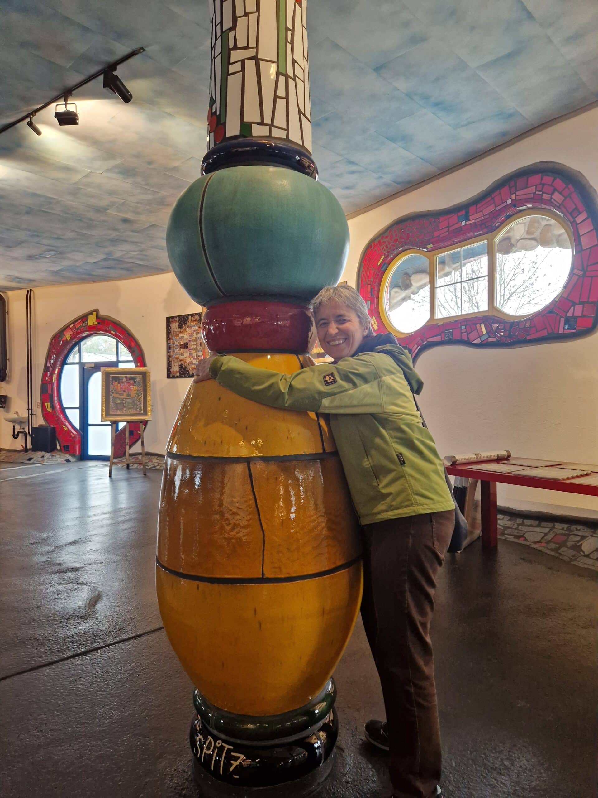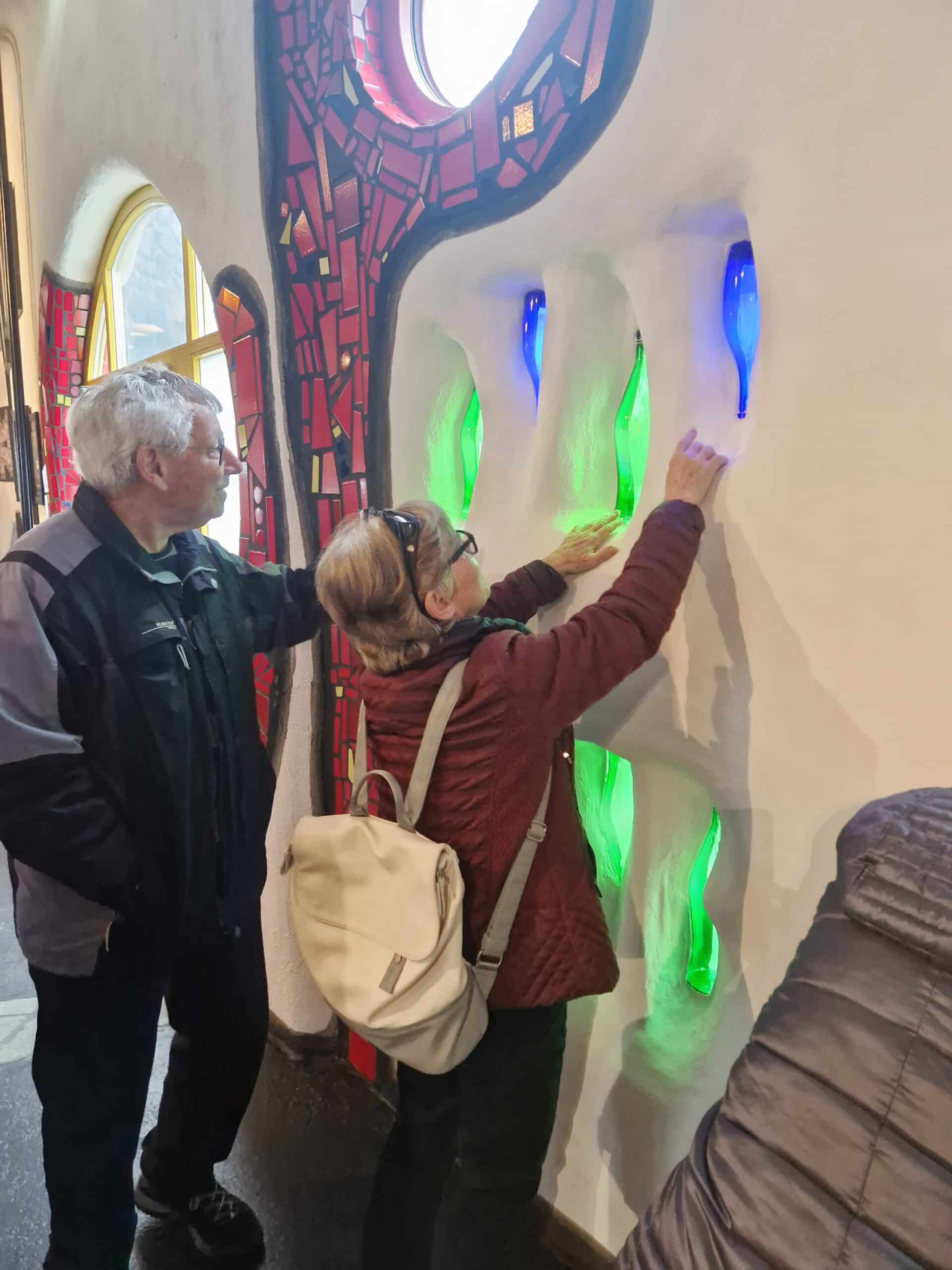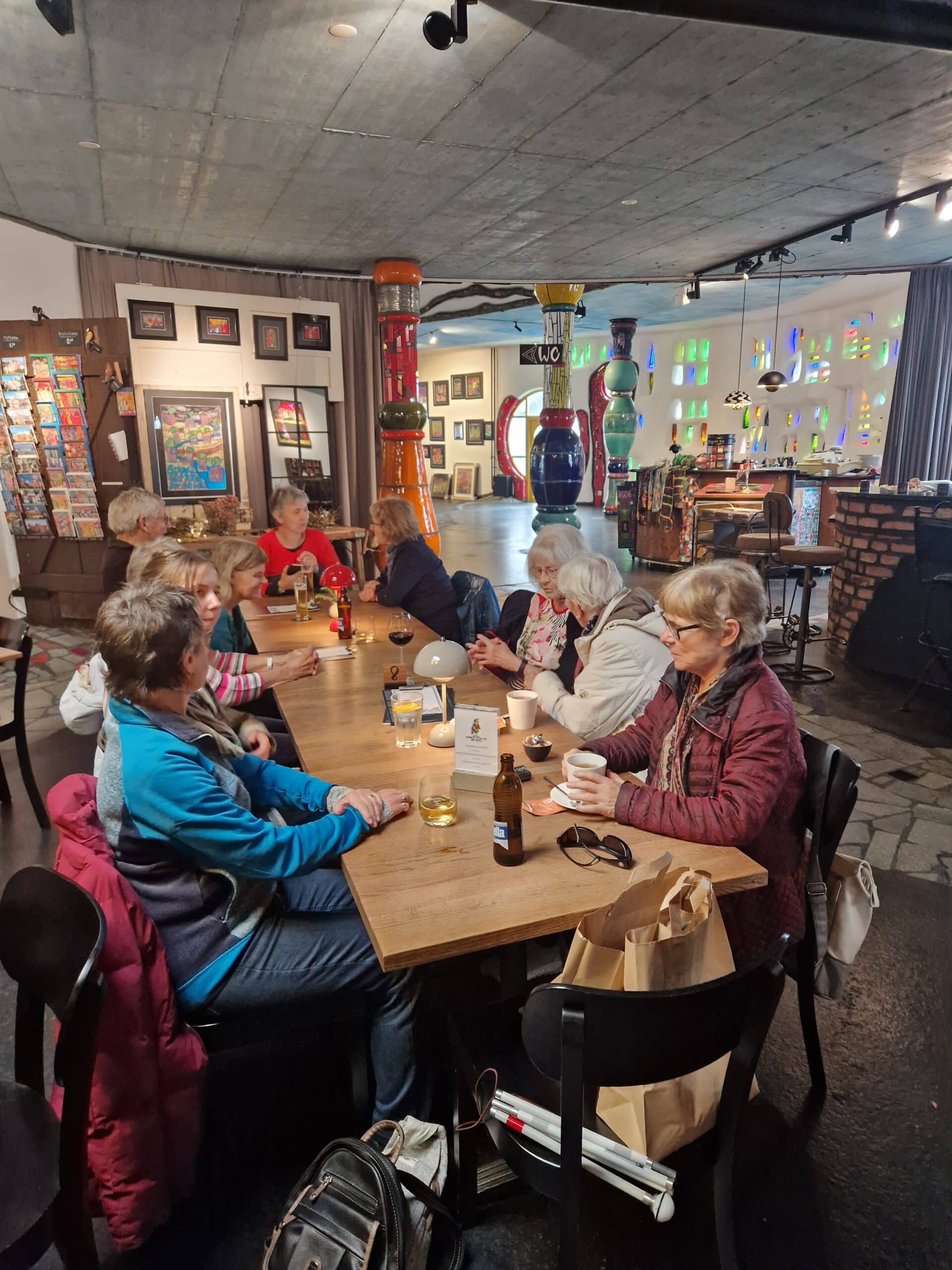 Bunte Formen und Spiralen Schon von weitem begrüsste uns die farbenfrohe Markthalle von Friedensreich Hundertwasser in Altenrhein am Bodenseeufer. Kennt ihr das: «Ihr tretet in einen Raum und werden von Farben und Formen umhüllt!» Genau so ging es uns, als wir mit einer Führung die Details und Raffinessen dieses wunderbaren Gebäudes mit Tasten und Fühlen erkundeten. Wir amüsierten uns an den uns erzählten Anekdoten aus der Bauphase, fanden Linien am Boden die einer Leitlinie ähneln und staunten über die Kunst, wie eine öffentliche Toilette auch noch gestaltet werden kann. Zum Abschluss genossen wir zusammen ein feines Mittagessen umgeben von märchenhafter Phantasie und mit dem Nachhauseweg endetet ein supertoller Tag.