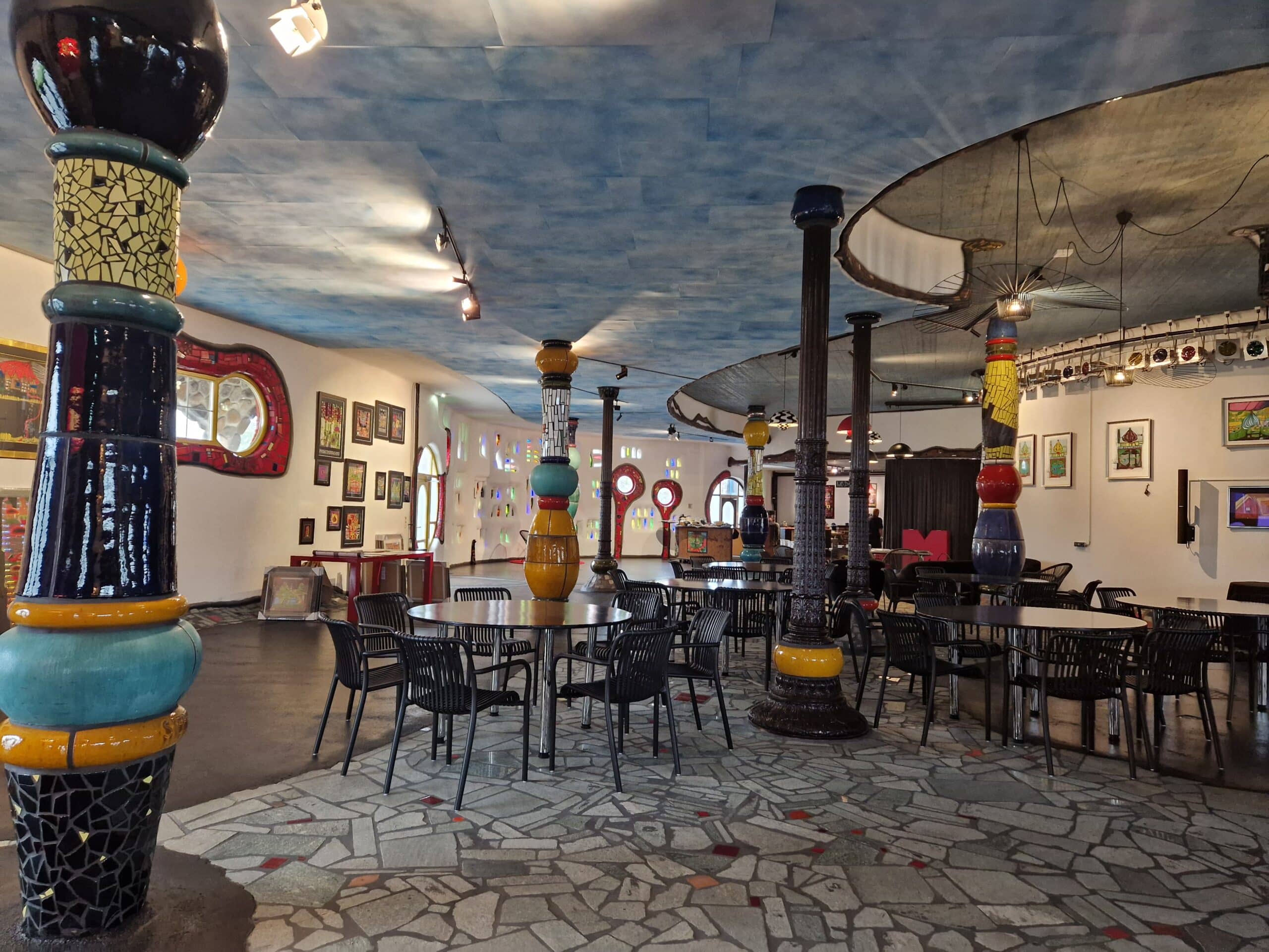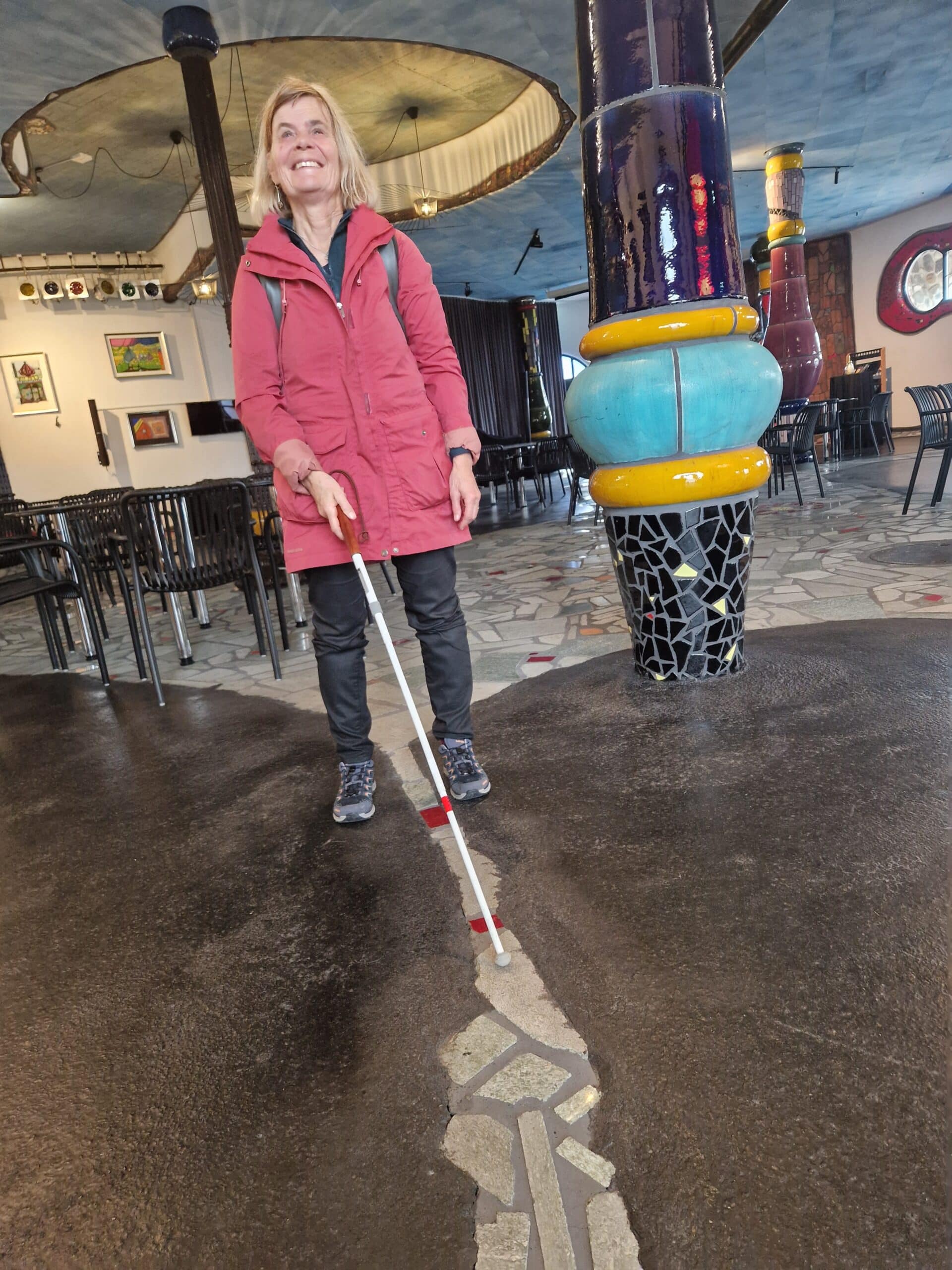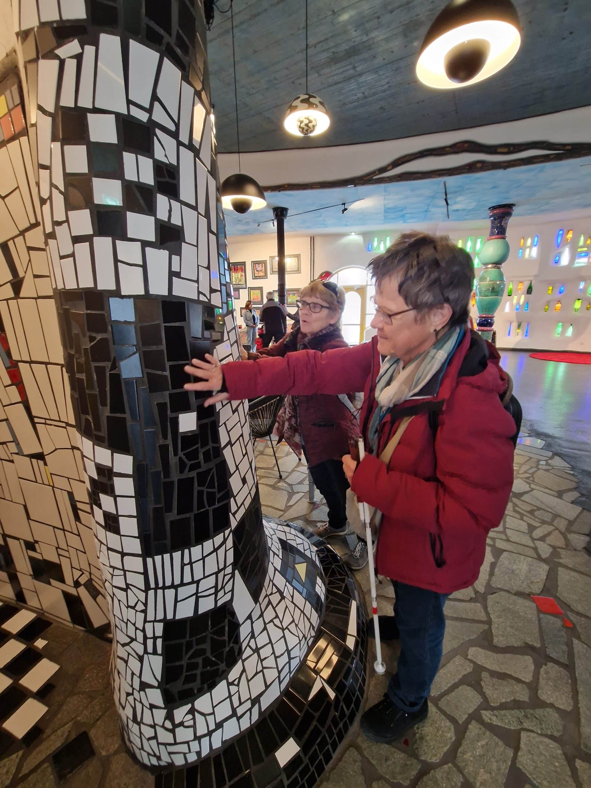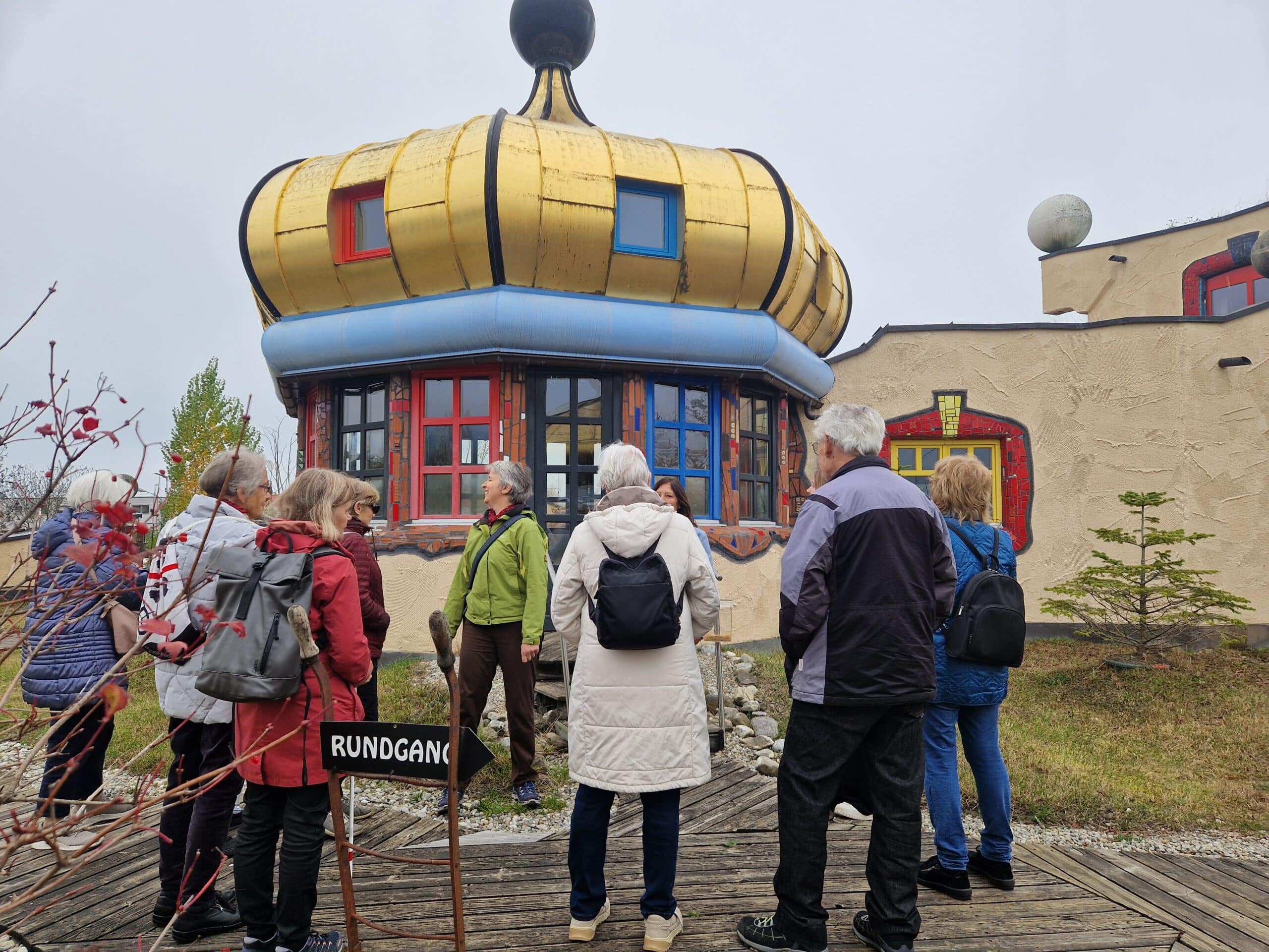 Bunte Formen und Spiralen Schon von weitem begrüsste uns die farbenfrohe Markthalle von Friedensreich Hundertwasser in Altenrhein am Bodenseeufer. Kennt ihr das: «Ihr tretet in einen Raum und werden von Farben und Formen umhüllt!» Genau so ging es uns, als wir mit einer Führung die Details und Raffinessen dieses wunderbaren Gebäudes mit Tasten und Fühlen erkundeten. Wir amüsierten uns an den uns erzählten Anekdoten aus der Bauphase, fanden Linien am Boden die einer Leitlinie ähneln und staunten über die Kunst, wie eine öffentliche Toilette auch noch gestaltet werden kann. Zum Abschluss genossen wir zusammen ein feines Mittagessen umgeben von märchenhafter Phantasie und mit dem Nachhauseweg endetet ein supertoller Tag.
