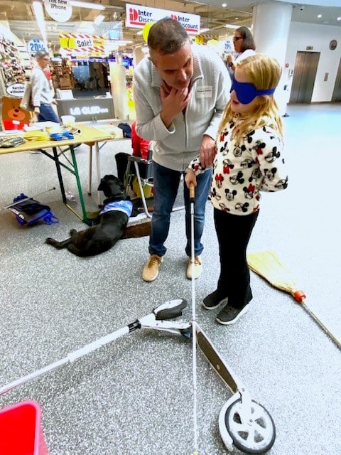 Am Tag des weissen Stocks konnten Interessierte selbst erleben, wie es ist, sich mit verdeckten Augen und weissem Stock fortzubewegen. Foto: sbv